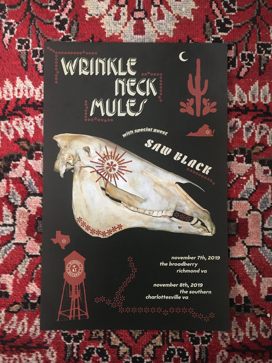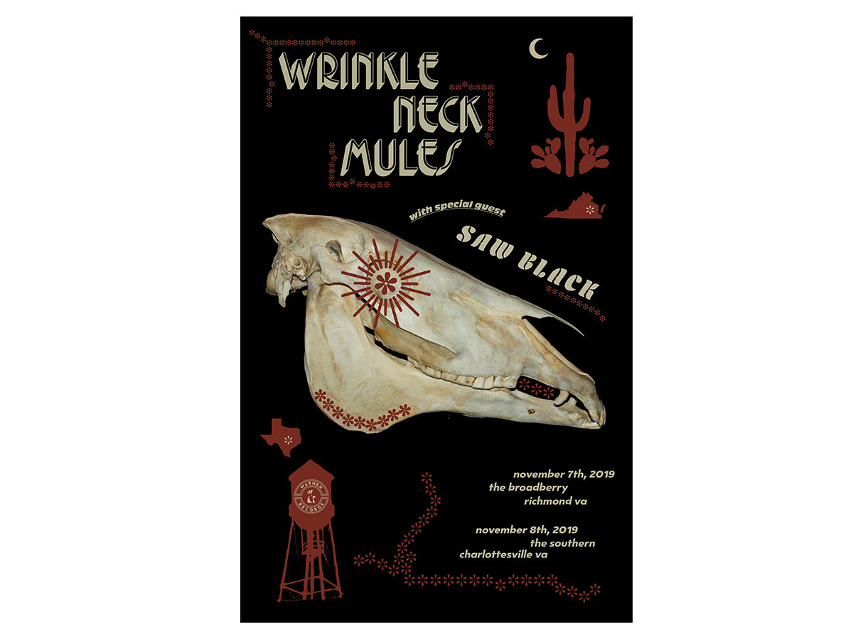 Poster commemorating the November 2019 Wrinkle Neck Mules shows in Richmond & Charlottesville VA with special guest Saw Black.